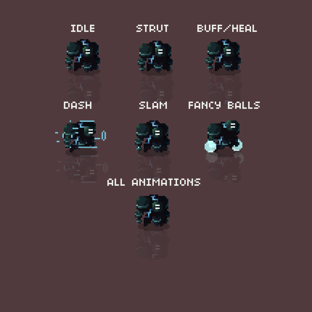 - Idle, Move, Buff/Heal, Beam Attack, Slam Attack, Rush, Rush End, Jump, Fall, Land Attack, Hit, & Death Animations