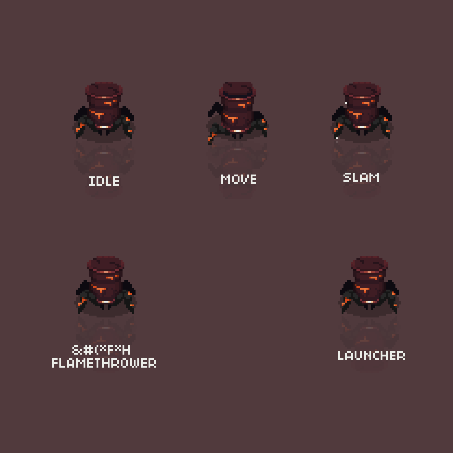 - Idle, Move, cannon, flamethrower (8 directions) , slam & Death Animations