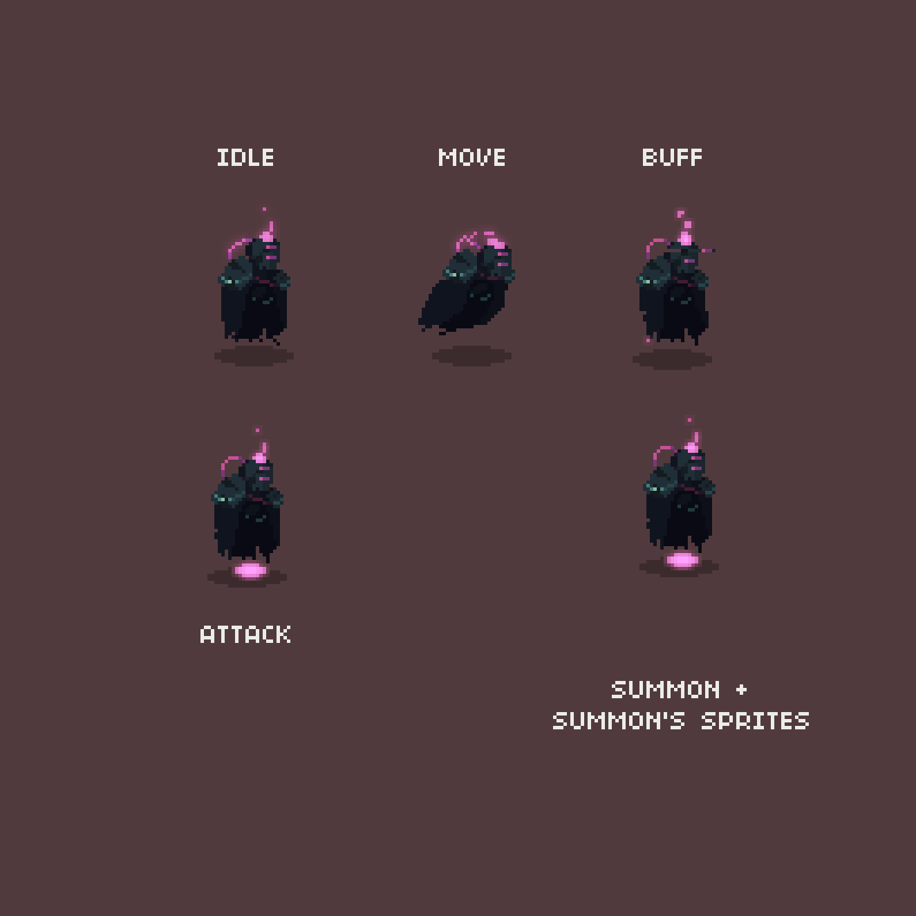 - Idle, Move, Buff, Cast (Sword Attack), Summon & Death Animations